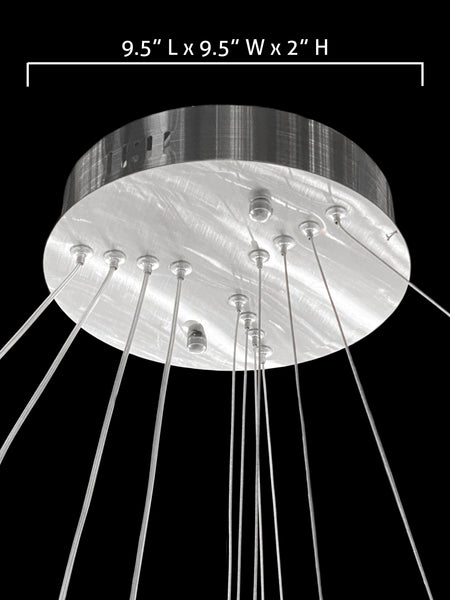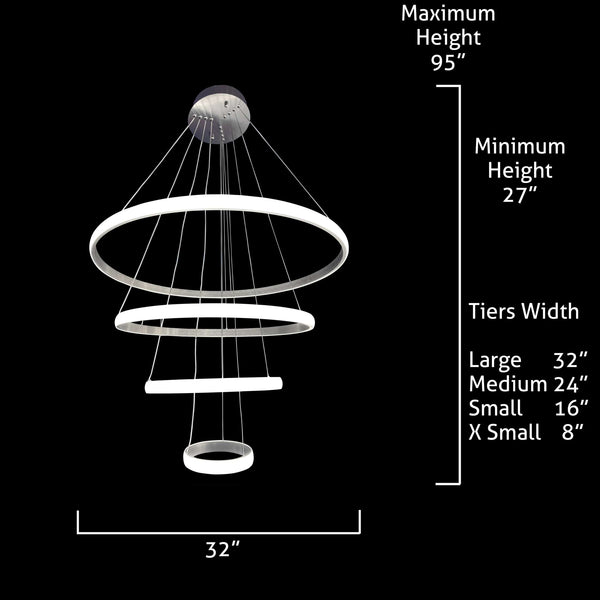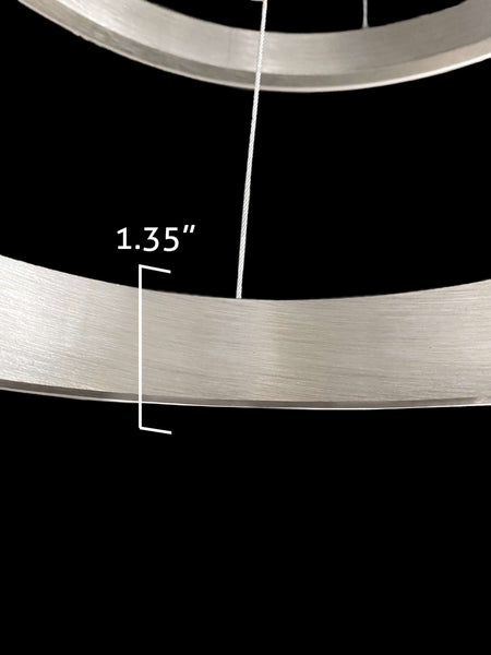 Crafted with a sculptural multi-tier silhouette, this modern LED ring chandelier brings refined contemporary elegance to any interior. Its brushed nickel finish and suspended geometric rings create a clean architectural presence, while the integrated LED driver delivers warm, consistent illumination without the need for external components. Perfect for living rooms, dining areas, bedrooms, and high-ceiling foyers, the adjustable cable system allows you to customize height and shape before installation.