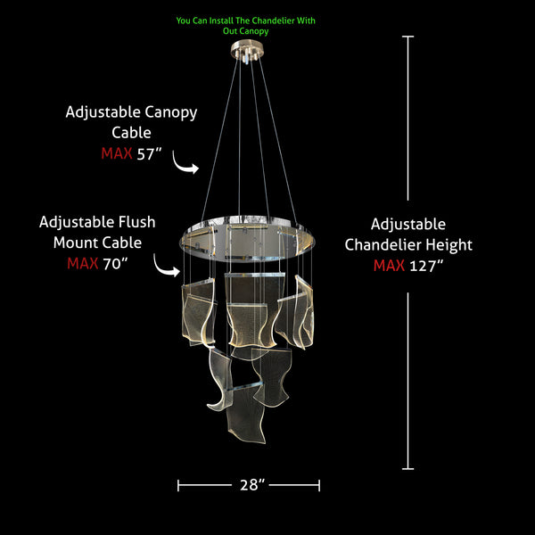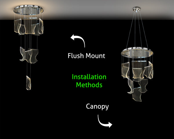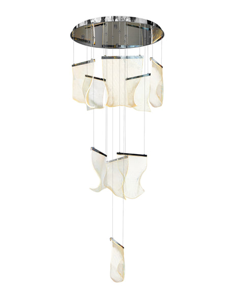 A sculptural expression of contemporary lighting, this LED chandelier features fluid wave panels suspended in a cascading form. Finished in reflective chrome, it radiates a warm 2700K glow, creating an atmosphere of modern serenity and visual impact. Designed with an integrated LED driver, it provides consistent illumination while maintaining a sleek, minimalist silhouette. Ideal for refined interiors seeking artistic presence and ambient control, it brings a sophisticated focal point to dining spaces, hallways, and contemporary living areas.