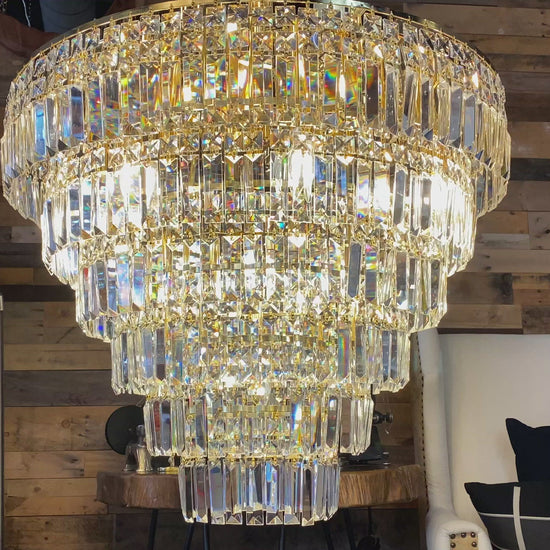 Defined by graceful 6- tiers and sculpted crystal geometry, this modern round traditional chandelier captures a balance of structure and shimmer. The polished gold finish amplifies its luminosity, while the precision-cut 30% lead crystals reflect light with depth and clarity. Perfectly scaled for dining rooms, living areas, bedrooms, office and entryways, it delivers a refined presence that complements both classic and contemporary interiors.