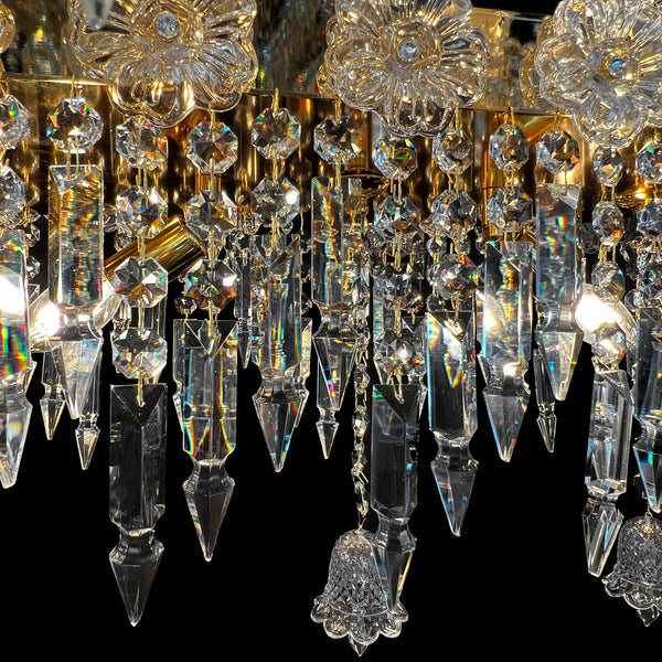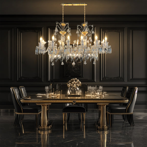 Inspired by the grandeur of French imperial design, this rectangular gold crystal chandelier brings opulence and architectural elegance to refined interiors. Carefully crafted with hand cut crystal drops and sculpted glass arms, it creates a radiant display of light and shadow. Its elongated silhouette is ideal for dining spaces, galleries, and grand living areas, delivering a statement of timeless luxury and artisanal craftsmanship