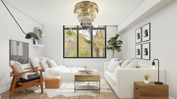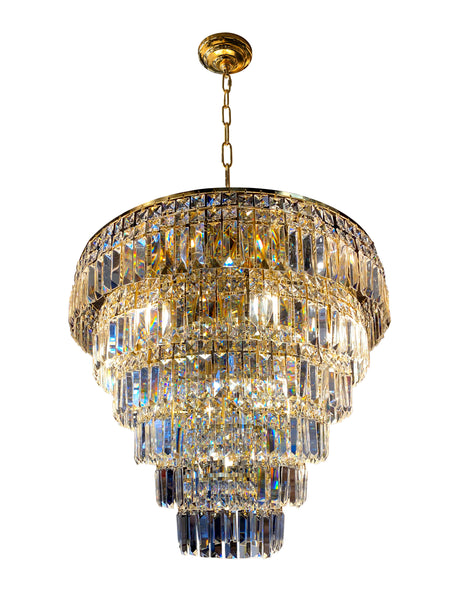 Defined by graceful tiers and sculpted crystal geometry, this modern traditional chandelier captures a balance of structure and shimmer. The gold finish amplifies its luminosity, while the precision-cut 30% lead crystals reflect light with depth and clarity. Perfectly scaled for dining rooms, living areas, bedrooms, and entryways, it delivers a refined presence that complements both classic and contemporary interiors.