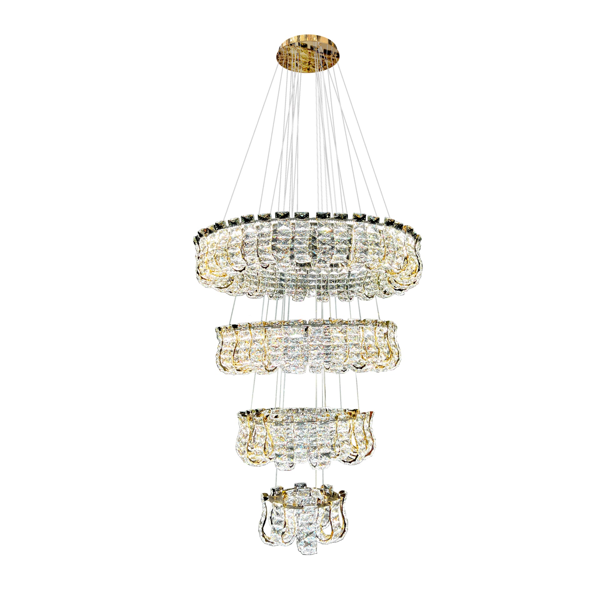 Elevate your high-ceiling spaces with this 4-tier gold crystal LED chandelier, crafted to create a dramatic sculptural presence. Precision-cut crystal rings reflect a luminous interplay of light and depth, transforming foyers, staircases, and double-height living areas into refined architectural statements. With remote-controlled LED technology, it offers adjustable brightness and three color temperatures for tailored ambiance.