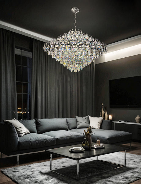 Transform your space with this stunning 31 inch chrome crystal teardrop chandelier, a true statement of modern luxury and craftsmanship. Feauture premium stainless steel and adorned with dazzling teardrop crystals, it delivers a radiant display of light that elevates any interior. With an adjustable 79-inch chain, this chandelier adapts perfectly to both vaulted and standard ceilings, making it ideal for dining rooms, foyers, and high-ceiling living areas. Designed for versatility and sophistication, it accommodates 27 E12 bulbs (up to 40W each, not included) and is fully dimmable when paired with a dimmer switch.