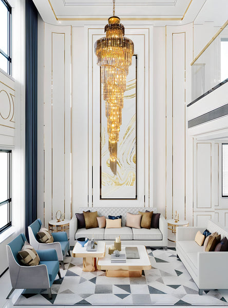 This grand gold crystal chandelier captures the essence of architectural luxury. Its cascading spiral silhouette creates a dramatic statement of light, It feature full-lead (30%) crystal , each crystal drop reflects a rich golden glow, bringing depth and radiance to modern or traditional interiors alike a true centerpiece of refined opulence. for elevating double-height spaces, Hotel, grand staircases, and entry foyers.