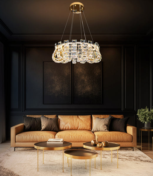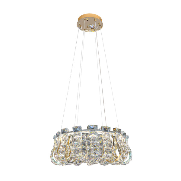 Bring refined luxury and radiant warmth to your home with this 23-inch Gold Crystal LED Chandelier. Expertly from premium stainless steel and high grade crystals, this modern pendant light features a polished gold finish that beautifully complements both classic and contemporary interiors. Designed for versatility, it includes three adjustable color temperatures (2700K warm, 4000K neutral, 6000K daylight) and dimmable functionality via remote control, offering tailored ambiance for every occasion.