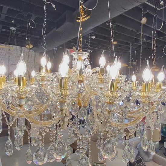 Elevate your interior with this exquisite Maria Theresa chandelier, crafted in a rich gold finish and adorned with 30% full-lead teardrop crystals for exceptional brilliance. Its hand-polished crystal arms and elegant candle-style silhouette bring timeless European refinement to classic, transitional, and upscale interiors. Perfect for living rooms, dining areas, foyers, and grand hallways, this radiant centerpiece delivers luxurious sparkle and architectural elegance to any setting.