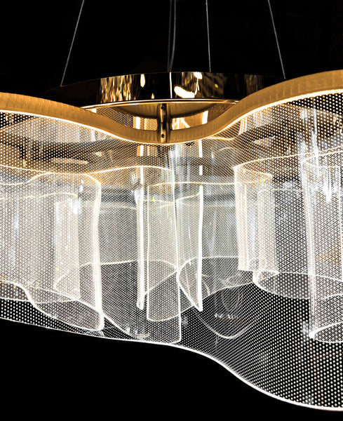 This modern gold LED chandelier brings refined elegance and soft illumination to any interior. Sculptural silhouette radiates a warm 2700K glow, creating a serene and luxurious ambiance The built-in LED driver ensures stable, energy-efficient lighting that enhances dining rooms, living spaces, and bedrooms with effortless sophistication.