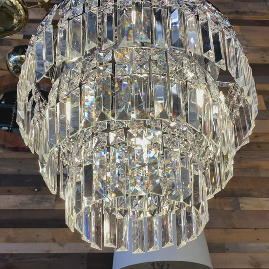 Defined by graceful 3- tiers and sculpted crystal geometry, this modern round traditional chandelier captures a balance of structure and shimmer. The polished chrome finish amplifies its luminosity, while the precision-cut 30% lead crystals reflect light with depth and clarity. Perfectly scaled for dining rooms, living areas, bedrooms, Kitchen island Closet and entryways, it delivers a refined presence that complements both classic and contemporary interiors.